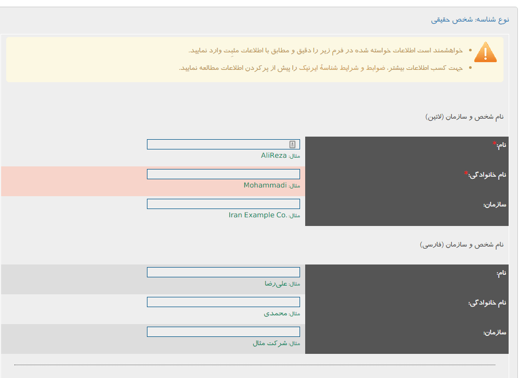 – نام شخص و سازمان ( به فارسی ) که باید نام خود و سازمان خود را به فارسی و مانند مثالهای زیر فرم تکمیل نمایید