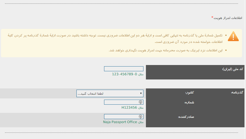 – اطلاعات احراز هویت که فقط کافی است شماره ملی را وارد کنید و اطلاعات مربوط به گذرنامه اجباری نیست