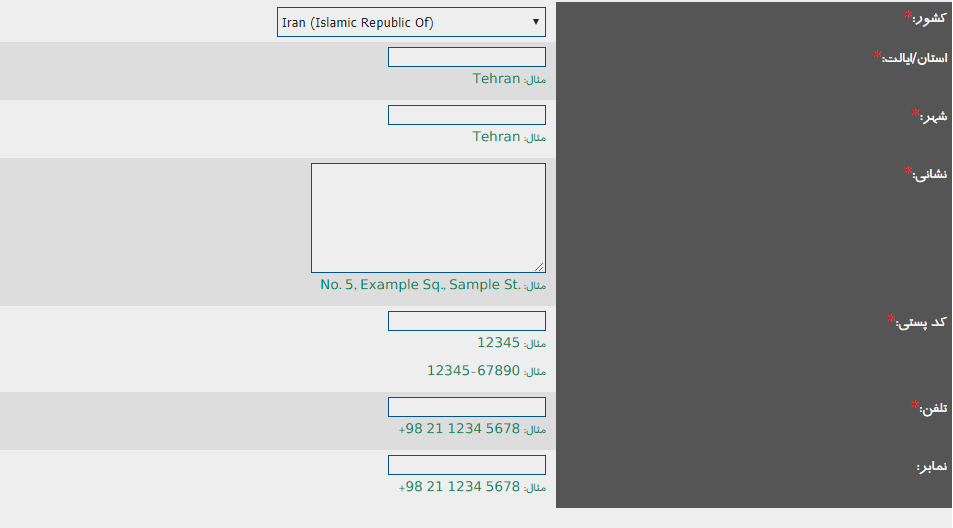 – نشانی پستی که باید به انگلیسی و مانند مثالهای زیر فرم تکمیل شوند