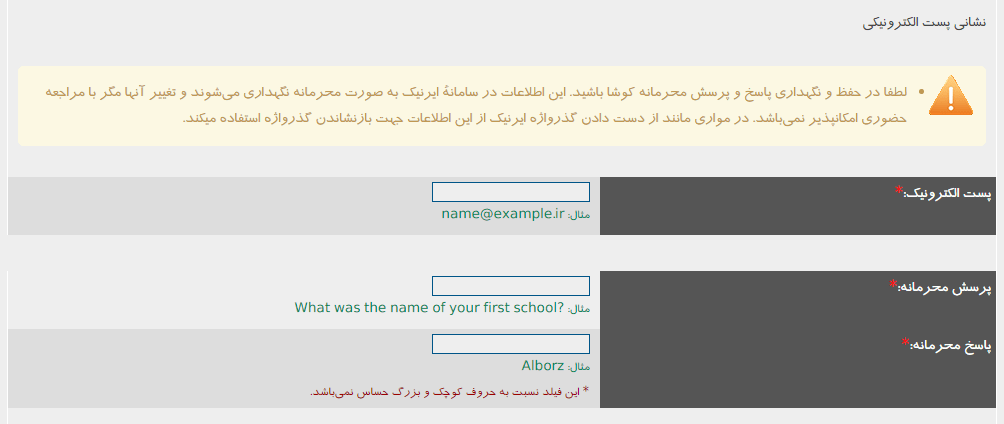 – نشانی پست الکترونیکی که در این قسمت علاوه بر پست الکترونیکی ، پرسش محرمانه را نیز تکمیل نمایید . ( این پرسش برای افزایش امنیت حساب کاربری شما میباشد و کافی است به انگلیسی یک سوال و یک جواب را مطرح کنید تا در مواقع ضروری یا مواقعی که رمز عبور فراموش شده است از آن استفاده کنید )