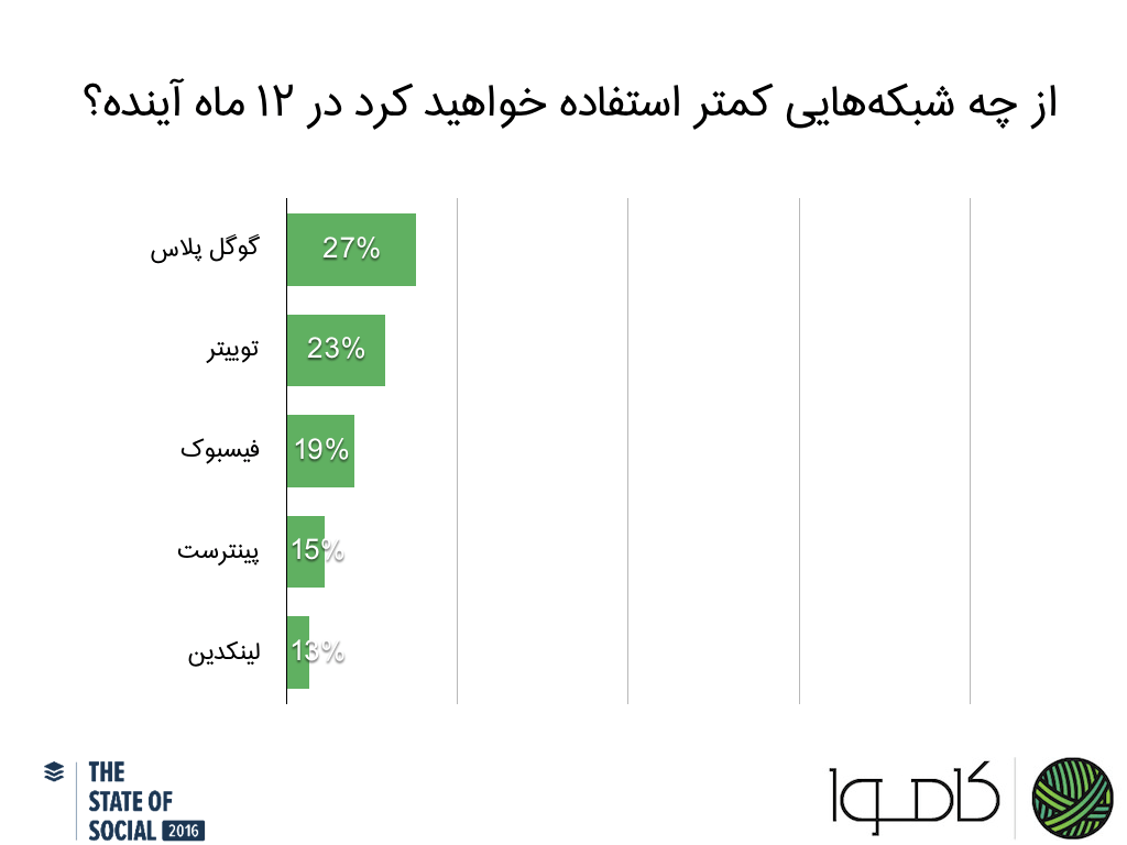 - گوگل پلاس رو به افول است: ۲۷ درصد گفتند که کمتر از گوگل پلاس در ۲۰۱۷ استفاده خواهند کرد